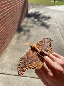 Anyway, back to the story: after a few selfies, Odysseus and I began an odyssey of our own around the quad looking for a good place for him to rest, preferably out of the wind and away from oblivious footfalls. Along the way, I kept paparazziing him and sent a truckload of pictures to my friends and family, most of whom were just as enamored by the handsome insect as I was. Not my suitemate though – she’s usually willing to help whenever I get myself into arthropod antics around the suite, but she’s not a fan of lepidopterans and wasn’t exactly thrilled when I FaceTimed her and filled her phone screen with a giant moth. On a definitely unrelated note, she moved out the next morning.
