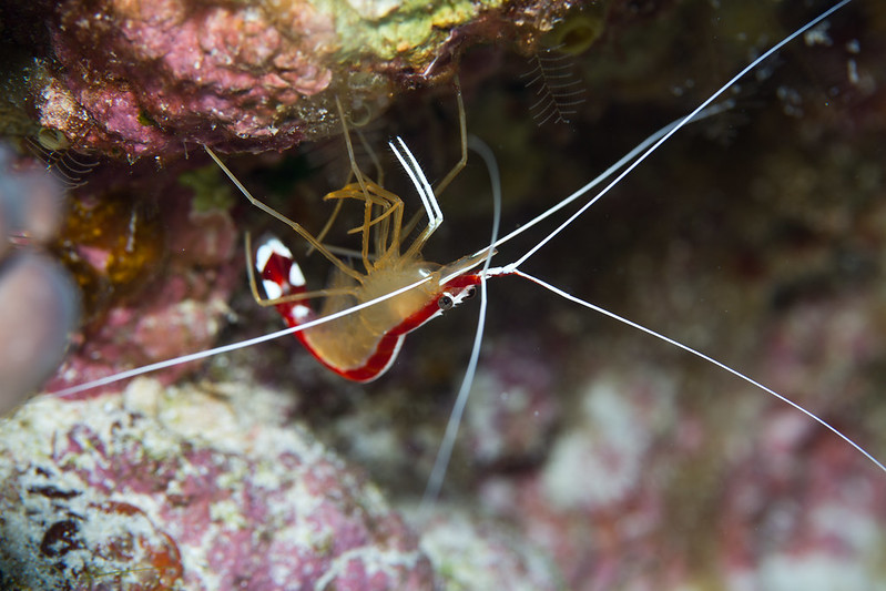 Although common in reefs, Pacific Cleaner Shrimp can also be found in small troupes (colonies) by underwater cave entrances about 20 meters deep. Individual shrimp in a troupe tend to keep their distance, but they still get along well with one another and other shrimp species living in the same area.