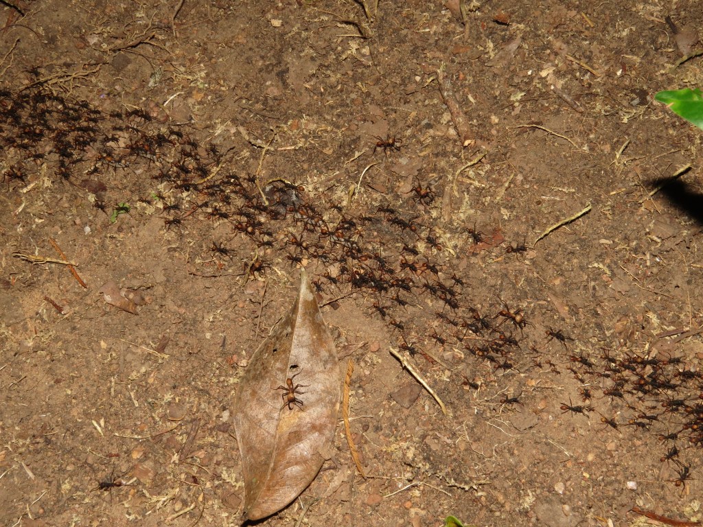 To join the ant parade, a butt beetle will clamp onto an army ant’s trunk just above its abdomen. Once it tucks in its legs and antennae, the disguise is complete—to the human eye, an army ant with a butt beetle hitchhiker will look like it has two abdomens! This doesn’t really do anything for the ant beside making it look funny, but it doesn’t hurt the ant either, so they don’t seem to mind walking around with an extra butt for a little while.